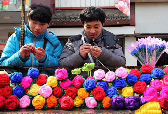 2月10日,南京夫子廟老街上的兩位男青年用絨線和鉤針編織手工玫瑰花引來(lái)圍觀。中新社發(fā) 泱波 攝據(jù)了解,這兄弟倆來(lái)自河南商丘,哥哥叫張冰、弟弟叫張贊,他倆在……