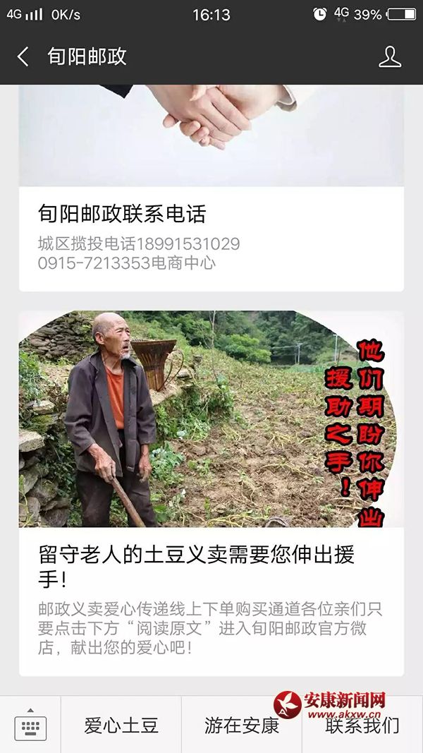 一是關(guān)注旬陽(yáng)郵政微信公眾號(hào),點(diǎn)擊右下角的“愛(ài)心土豆”鏈接,進(jìn)入旬陽(yáng)郵政官方微店直接購(gòu)買(mǎi);