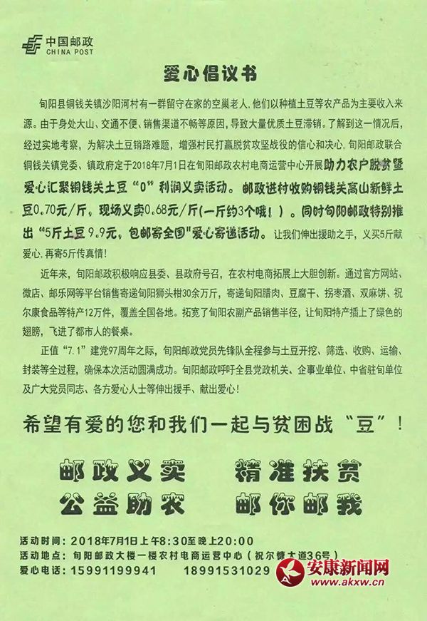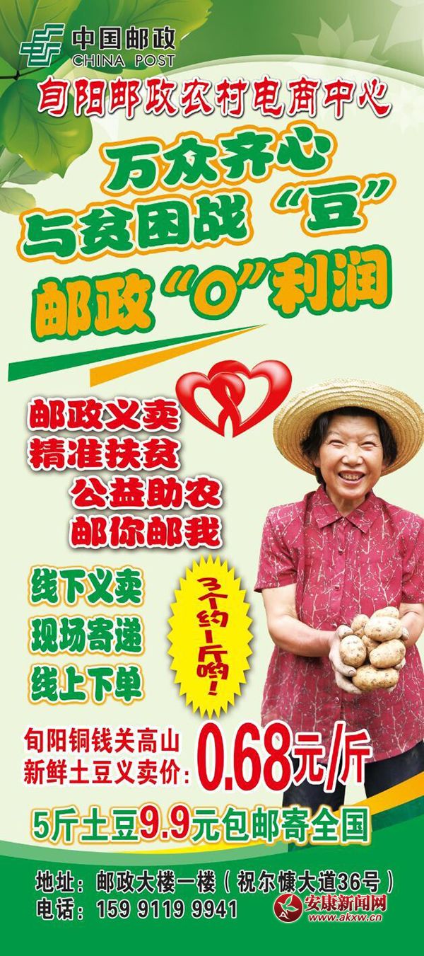 進(jìn)村高價(jià)回收、線(xiàn)下低價(jià)義賣(mài):旬陽(yáng)郵政公司已經(jīng)與銅錢(qián)關(guān)鎮(zhèn)黨委、鎮(zhèn)政府對(duì)接聯(lián)合,赴沙陽(yáng)河村收購(gòu)高山新鮮土豆0.70元/斤,現(xiàn)場(chǎng)義賣(mài)0.68元/斤。對(duì),你沒(méi)有看錯(cuò),真正的高價(jià)收購(gòu),低價(jià)義賣(mài),只為貧困戶(hù)的勞動(dòng)有尊嚴(yán)。定于2018年7月1日8點(diǎn)30分至晚上8點(diǎn),在旬陽(yáng)郵政大樓一樓農(nóng)村電商運(yùn)營(yíng)中心開(kāi)展“助力農(nóng)戶(hù)脫貧暨愛(ài)心匯聚銅錢(qián)關(guān)土豆義賣(mài)活動(dòng)”。
