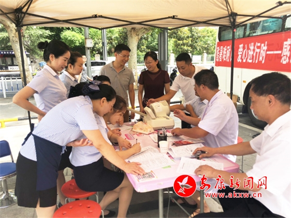 早晨的空氣格外清新,前夜的大雨帶走了不少暑氣,給了悶熱的夏日送來一絲難得的清涼。8點(diǎn)不到,安康市中心血站的獻(xiàn)血車已?吭谒募静惋嫲部蒂e館門前,等待著獻(xiàn)血者的到來。上午九點(diǎn)半,結(jié)束了例會的員工們陸續(xù)來到車前,大家圍坐在一起體檢、填表,市中心血站副站長詹勝萍,獻(xiàn)血服務(wù)科科長潘登也來到活動(dòng)現(xiàn)場,與工作人員一同做起動(dòng)員工作,詹副站長親切耐心地為獻(xiàn)血者講解血液常識,發(fā)放宣傳彩頁,叮囑獻(xiàn)血注意事項(xiàng),活動(dòng)現(xiàn)場的氣氛十分活躍。