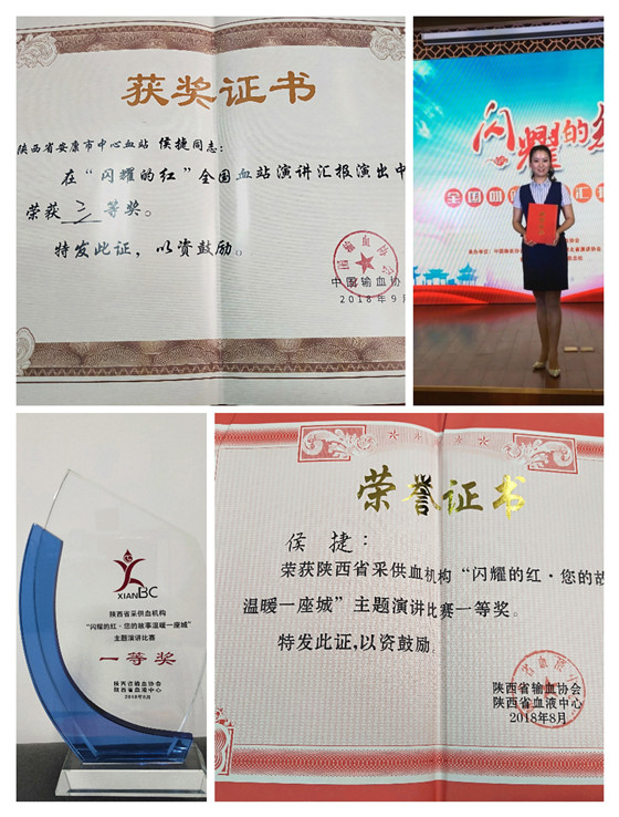 我站血源管理科侯捷同志,根據(jù)自己血站崗位工作成長經(jīng)歷,結(jié)合血源一線招募典型事例,充分展示安康無償獻(xiàn)血招募宣傳模式,以“成長在生命年輪中的信仰”為題,代表安康市中心血站參加陜西省“閃耀的紅--您的故事溫暖一座城”血站系統(tǒng)演講比賽,以獨(dú)特的視角和演講效果奪得冠軍,并選派于9月21日代表陜西省采供血行業(yè)參加“閃耀的紅”全國血站演講比賽榮獲三等獎,是我站首次在全省、全國演講比賽中取得的最佳成績,為我站在全國范圍內(nèi)贏得了榮譽(yù),為安康、陜西血站行業(yè)系統(tǒng)爭了光,在全國血液行業(yè)內(nèi)展示了我站職工昂揚(yáng)向上的精神風(fēng)貌。