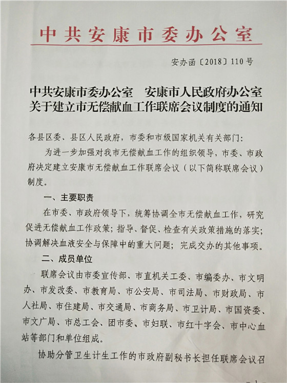 2、安康市率先在全省建立首個無償獻(xiàn)血聯(lián)系會議制度 安康無償獻(xiàn)血聯(lián)席會議制度是在安康市委、市政府領(lǐng)導(dǎo)下,由市委宣傳部等21個市級部門和單位組成,協(xié)助分管衛(wèi)生計生工作的市政府副秘書長擔(dān)任聯(lián)席會議召集人。聯(lián)席會議每年召開一次全體會議,主要職責(zé)為統(tǒng)籌協(xié)調(diào)全市無償獻(xiàn)血工作,研究促進(jìn)無償獻(xiàn)血工作相關(guān)政策,指導(dǎo)、督促、檢查有關(guān)政策措施的執(zhí)行落實(shí),協(xié)調(diào)解決血液安全與保障中的重大問題。聯(lián)系會議制度的建立,標(biāo)志著我市無償獻(xiàn)血宣傳招募模式“政府主導(dǎo)、部門協(xié)作、社會參與、城鄉(xiāng)聯(lián)動”的發(fā)展格局和長效機(jī)制得到進(jìn)一步鞏固和提升。