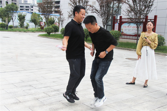 雙人項(xiàng)目考驗(yàn)的是默契度和耐力,不少組合也亮點(diǎn)紛呈,有面對(duì)面跳的,有側(cè)身對(duì)面跳的,還有背對(duì)著跳的,不管姿勢如何,共同的節(jié)奏是保持勝利的關(guān)鍵,當(dāng)然雙人跳到最后還得拼體力,不少選手氣息節(jié)奏被打亂,但大家都咬牙堅(jiān)持,沒人選擇放棄,哪怕絆亂了繩子一次次重來也要堅(jiān)持到最后一秒,周圍同事也不斷為場上選手加油鼓勁,氣氛相當(dāng)熱烈。