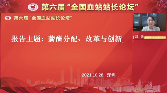 為加強全國血站的經驗交流與合作,2021年10月27日至28日,第六屆 “全國血站站長論壇”在深圳市舉辦。中國輸血協(xié)會理事長、世界衛(wèi)生組織輸血合作中心主任朱永明,深圳市衛(wèi)健委二級巡視員林漢城等相關領導出席并致辭。此次論壇的主題是“血站建設與發(fā)展、改革與創(chuàng)新”,來自全國各省、市血液中心(血站)的同仁通過線上方式參加會議。安康市中心血站副站長鄧娟作為全國血站六個優(yōu)秀論文交流發(fā)言人之一,就安康血站績效分配、改革與創(chuàng)新工作在會上進行了經驗交流。