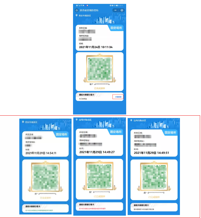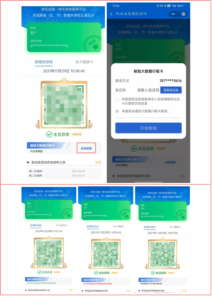 居民可在微信或支付寶中打開(kāi)陜西健康碼小程序的“我的防控碼”界面,就能看到在防控碼下方專有一欄“通信大數(shù)據(jù)行程卡”,“點(diǎn)擊核驗(yàn)”即可根據(jù)陜西疫情防控碼所綁定手機(jī)號(hào)查詢最近14天是否到過(guò)中高風(fēng)險(xiǎn)地區(qū)。并且疫情防控碼頁(yè)面上僅保留當(dāng)日的核驗(yàn)結(jié)果,如第二天使用需要再次點(diǎn)擊核驗(yàn)。
