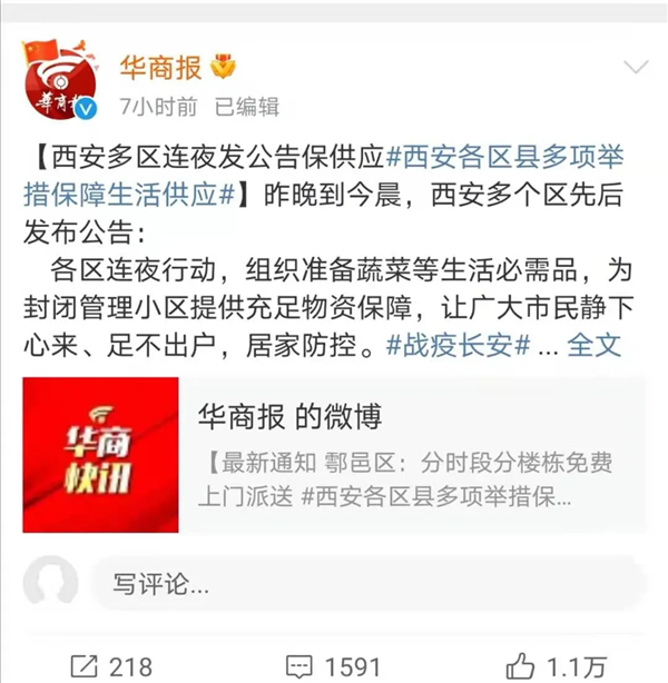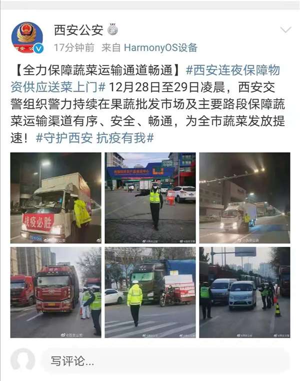 12月28日晚,西安全市總動員組織準備蔬菜等生活必需品,為封閉管理小區(qū)提供充足物資保障,鄠邑區(qū)、碑林區(qū)、雁塔區(qū)、高新區(qū)等陸續(xù)發(fā)布物資保障公告,讓廣大市民靜下心來、足不出戶,居家防控。
