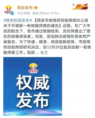 12月29日,西安市疫情防控指揮部辦公室發(fā)布關于開展新一輪核酸篩查的通告,近期,在廣大市民的配合下,西安市通過核酸檢測,及時篩查出了潛在的病毒感染者。但是,新冠肺炎疫情形勢依然嚴峻復雜,為了快速、精準、徹底阻斷疫情,西安市疫情防控指揮部研究決定,自12月29日起啟動新一輪核酸篩查工作。