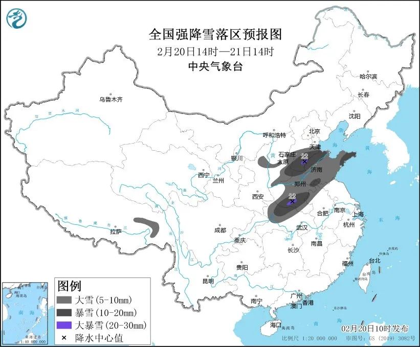 20日至22日,中東部地區(qū)將出現大范圍雨雪天氣。預計2月20日14時至2月21日14時,陜西北部、山西東南部、河北南部、山東、河南、安徽北部、湖北西部、西藏東部等地部分地區(qū)有大到暴雪,其中,河北南部、河南南部等地局地有大暴雪(20~22毫米)。上述部分地區(qū)新增積雪深度3~8厘米,局地可達12厘米以上。
