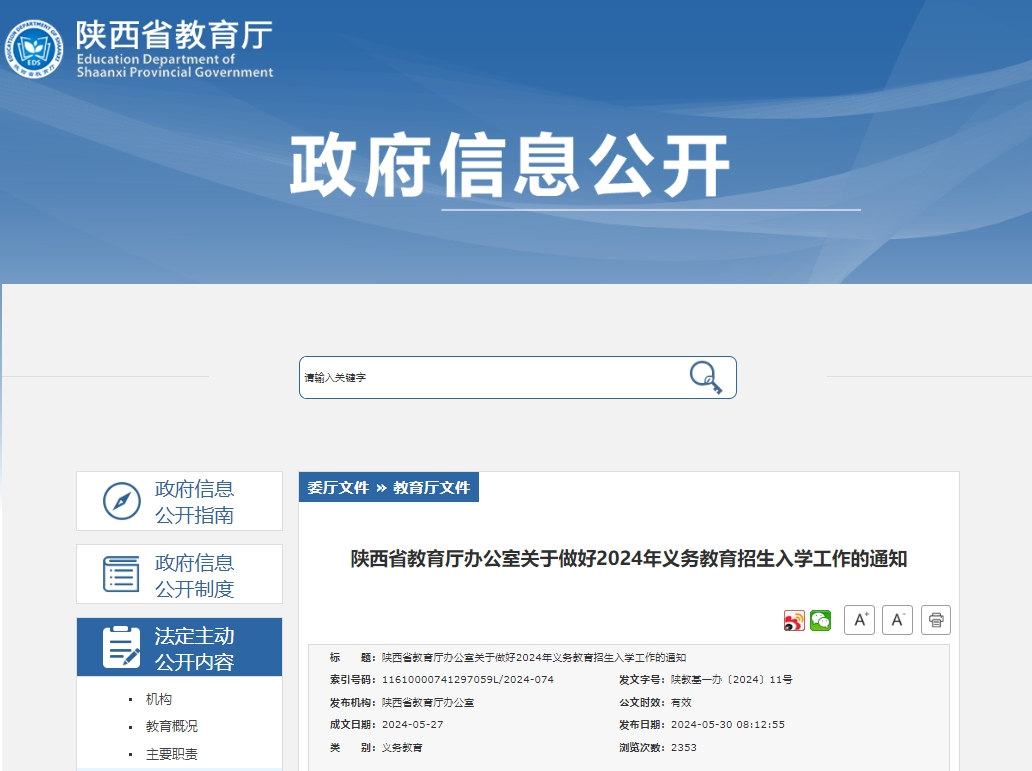 陜西省教育廳辦公室關于做好2024年義務教育招生入學工作的通知