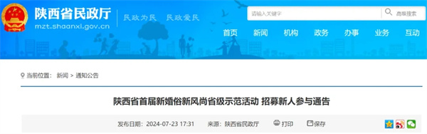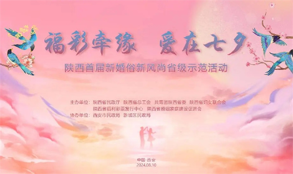 今年的8月10日,是中國(guó)傳統(tǒng)的七夕佳節(jié),為大力推進(jìn)婚姻領(lǐng)域移風(fēng)易俗,引導(dǎo)新人樹立文明、健康、理性的婚戀觀,陜西省民政廳等4部門計(jì)劃舉辦“福彩牽緣 愛在七夕”陜西省首屆新婚俗新風(fēng)尚省級(jí)示范活動(dòng),現(xiàn)面向全省招募新人。