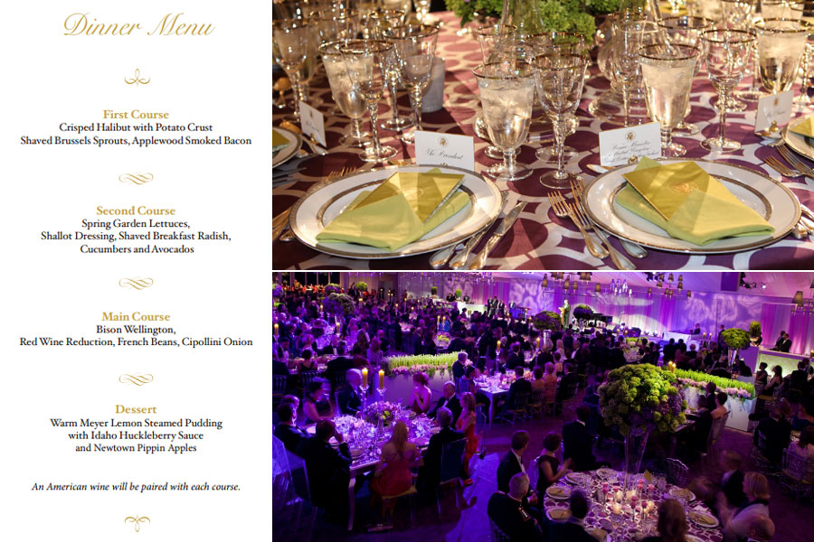 國宴的主題為“收獲”。第一道菜是炸比目魚配煎馬鈴薯,輔以采自白宮花園的新鮮嫩甘藍、布魯塞爾小包菜以及蘋果木熏肉。
