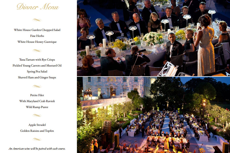 美國白宮2011年10月13日迎來了韓國總統(tǒng)李明博的訪問。當(dāng)天晚上,奧巴馬設(shè)國宴款待李明博。白宮官網(wǎng)在介紹國宴菜品時(shí)說,當(dāng)晚的菜品是當(dāng)?shù)刈詈玫氖巢暮晚n國傳統(tǒng)風(fēng)味結(jié)合的成果。