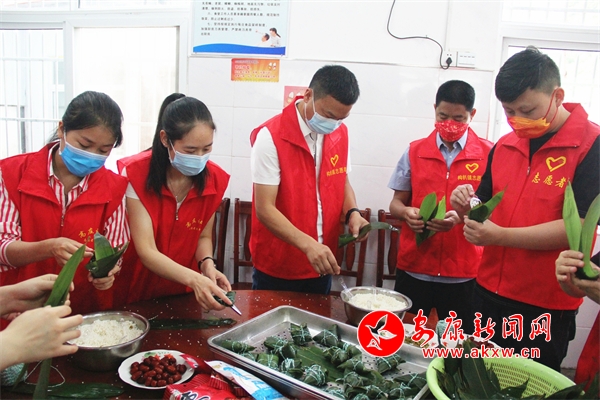 △ 構朳鎮(zhèn)組織志愿者到敬老院給老人們包粽子