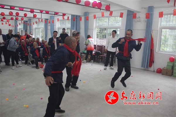 △ 構朳鎮(zhèn)組織敬老院的老人們做趣味游戲