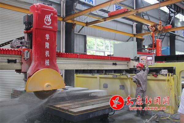 △ 賽樂石業(yè)生產(chǎn)車間內(nèi)工人正在操作機器切割石材
