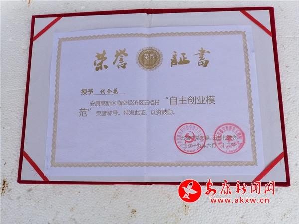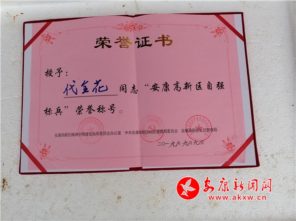 筆者從陳斌口中得知,2019年6月,代全花分別被安康高新區(qū)和五檔村黨支部、村委會授予“自強標兵”和“自主創(chuàng)業(yè)模范”榮譽稱號,去年一家成功實現(xiàn)了脫貧。