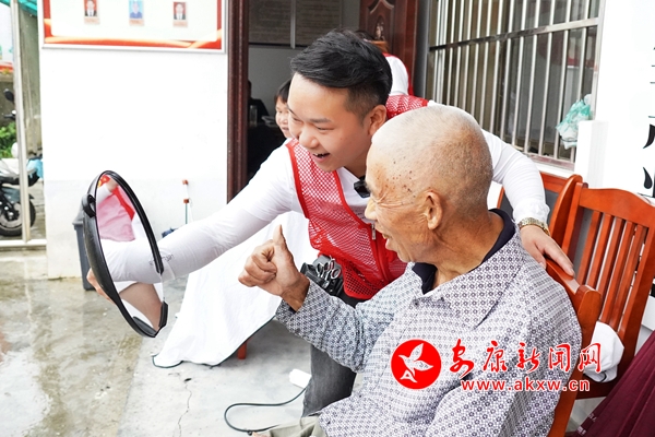 在村委會(huì)院子里,理發(fā)師龔甲超一邊與前來剪發(fā)的老人耐心溝通,詢問理發(fā)需求,一邊和老人們拉家常。剪發(fā)聲、說笑聲久久回蕩,現(xiàn)場(chǎng)熱鬧非凡。理完發(fā)的老人們精神抖擻,看著鏡子中的新發(fā)型,不由自主地向理發(fā)師豎起了大拇指。