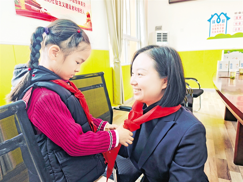 學(xué)生為愛(ài)心人士系上紅領(lǐng)巾。