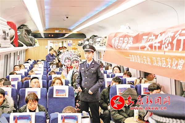 火車穿越秦巴山水間,途中,來自安康漢調(diào)二黃研究院的專業(yè)演員和地方民間漢調(diào)二黃愛好者們一同表演了國家級非物質(zhì)文化遺產(chǎn)——漢調(diào)二黃經(jīng)典戲曲演唱,并為旅客們講解漢調(diào)二黃戲曲知識,與旅客們開展互動交流,讓旅客親身體驗漢調(diào)二黃戲服道具,感受漢調(diào)二黃的獨特藝術(shù)魅力。來自漢濱區(qū)文化館的漢濱剪紙技藝傳承人為旅客們展示講解了安康市級非物質(zhì)文化遺產(chǎn)——漢濱剪紙技藝,向參與互動的旅客送上了親手創(chuàng)作的漢濱剪紙作品,提前送上新春祝福;顒又,西安鐵路公安局安康公安處的民警們和文藝工作者們一同宣傳普及了反詐知識,進一步提升旅客的安全防范意識。