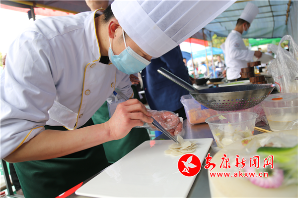 比賽現(xiàn)場,一個個灶臺熱火朝天,參賽選手或精雕細(xì)琢,或揮鏟舞勺,按照色、香、味、形四項標(biāo)準(zhǔn),充分發(fā)揮自己的精湛廚藝,熱油、翻炒、調(diào)味,現(xiàn)場菜香撲鼻,美食盛宴讓人垂涎欲滴,觀賽人員看得津津有味。評審組人員現(xiàn)場專業(yè)的品嘗、打分。