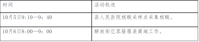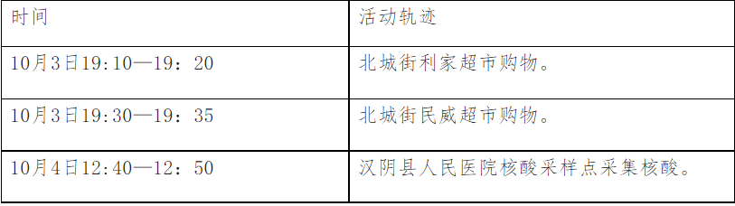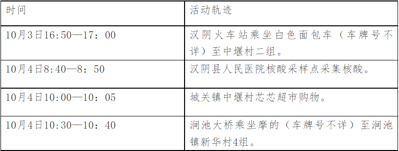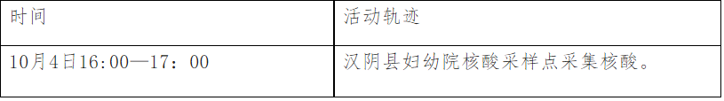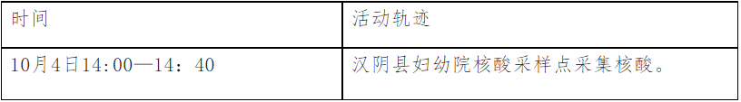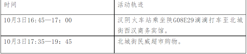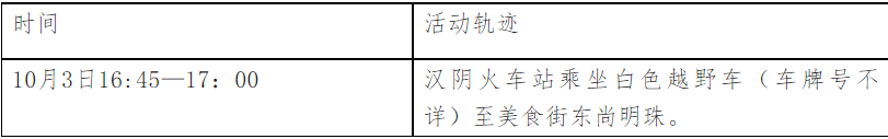 根據(jù)流調(diào)情況,現(xiàn)將漢中一例初篩陽(yáng)性病例涉及密切接觸者在漢陰縣公共場(chǎng)所活動(dòng)軌跡公布如下: