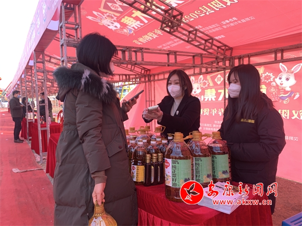 活動現(xiàn)場,伴隨著喜慶的音樂聲,攤位上擺滿了各種各樣的年貨,洋溢著濃濃的年味。市民們穿梭其中,漢陰炕炕饃、漢陽蒸盆子、純正菜籽油、臘肉和香腸、年節(jié)飾品等60余種商品齊聚這里,吸引著過往消費者駐足品嘗、選購。