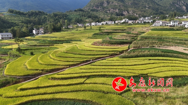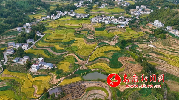 鳳堰梯田的1.2萬畝連片水稻迎來了豐收季,蜿蜒盤旋的金黃色線條從山腳盤繞至山腰,層層疊疊的稻田與整潔的村莊、蜿蜒的道路、遠(yuǎn)方的青山相映成趣,美不勝收。農(nóng)戶們也搶抓晴好天氣,確保顆粒歸倉(cāng),勤勞的鄉(xiāng)親們穿梭在稻田中,構(gòu)成了一幅祥和而廣闊的秦巴山區(qū)農(nóng)耕文明美麗畫卷。