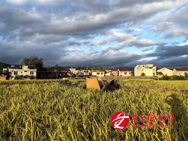 走進(jìn)新河村,陽(yáng)光灑在沉甸甸的稻穗上,飽滿的谷粒泛著金黃光澤。微風(fēng)拂過(guò),連片稻田掀起層層稻浪,裹挾著清新的谷物香氣彌漫田間。稻田里,農(nóng)機(jī)手熟練地操控著收割機(jī),在田間來(lái)回穿梭,機(jī)身所過(guò)之處,水稻快速完成脫粒、秸稈分離,金黃的稻谷源源不斷送入機(jī)倉(cāng),實(shí)現(xiàn)顆粒歸倉(cāng);為進(jìn)一步加快水稻收割進(jìn)度,幾位村民則支起拌桶,手持稻把用力拍打,沿用傳統(tǒng)打谷技藝同步搶收,機(jī)器轟鳴聲、打谷聲與村民的歡聲笑語(yǔ)交織成秋日豐收的“協(xié)奏曲”。