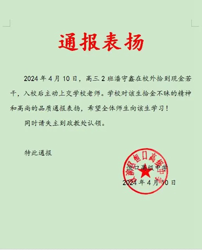 該校對潘守鑫同學拾金不昧的善舉進行了表揚,并號召全校師生學習這種拾金不昧的精神,充分發(fā)揚中華民族的傳統(tǒng)美德。