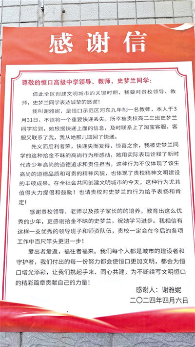 小城大愛,溫暖無處不在。近日,在恒口高級中學(xué),河?xùn)|九年制學(xué)校教師謝雅妮給該校學(xué)生史夢蘭送來了一封暖意融融的感謝信,向她拾金不昧的行為表示感謝,也為學(xué)校的德育工作點(diǎn)贊。