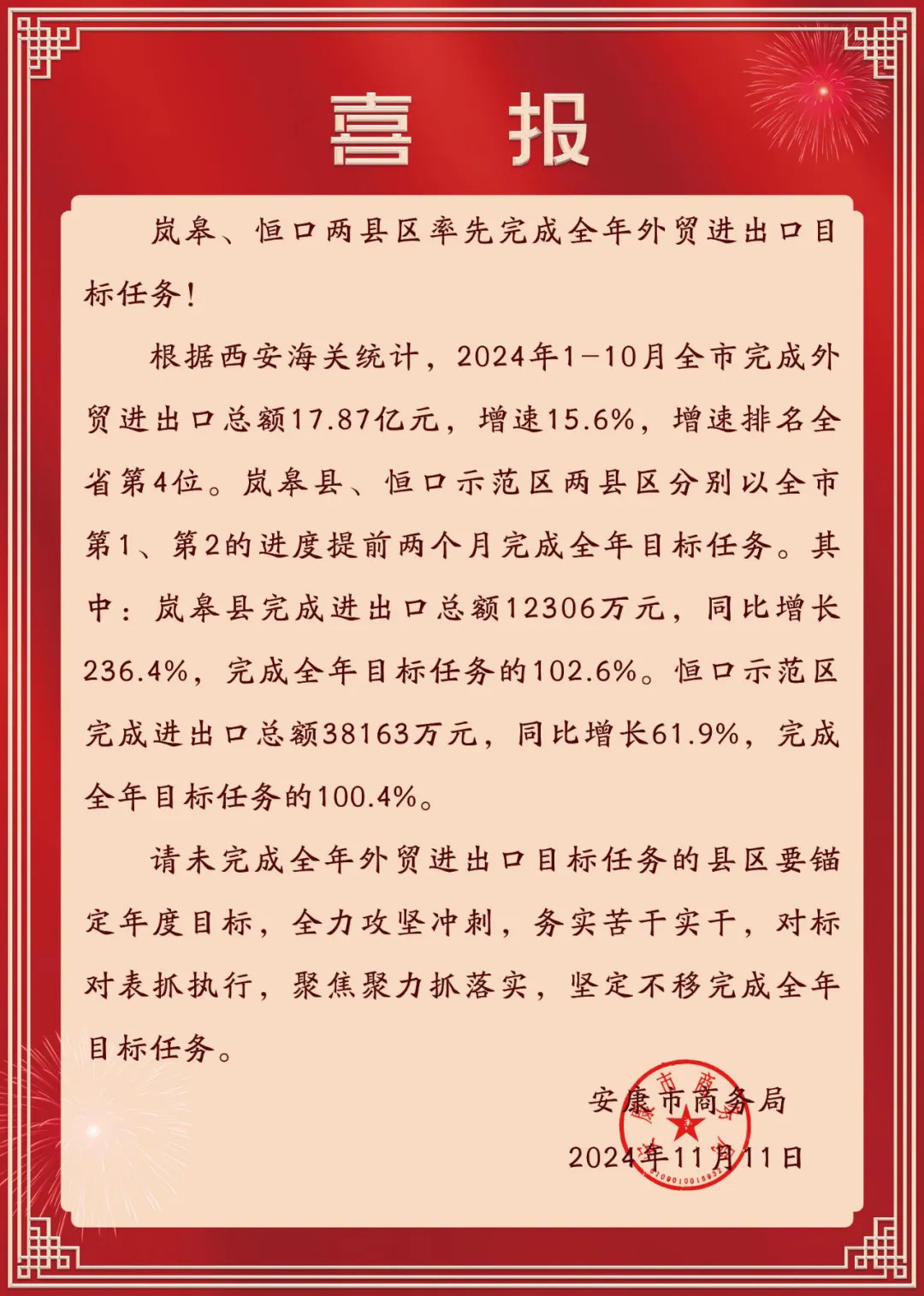 近日,市商務局發(fā)來喜報,恒口示范區(qū)率先完成全年外貿(mào)進出口目標任務。