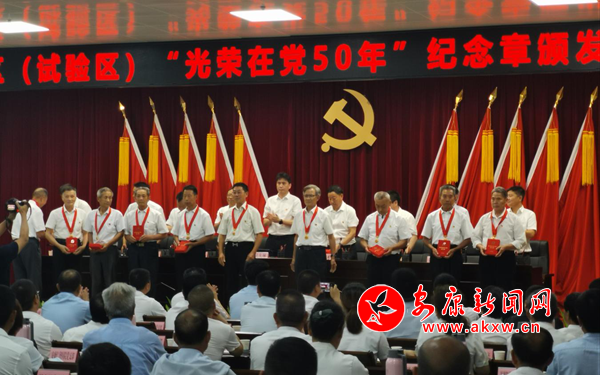 在慶“七一”表彰大會上,全體參會黨員面對鮮紅的黨旗,高舉右手,重溫入黨誓詞,鏗鏘嘹亮的宣誓聲響徹會場,激蕩人心,昭示著全區(qū)黨員矢志不渝為黨和人民事業(yè)不懈奮斗的堅(jiān)定信念。會上,為高劍村黨支部等10個(gè)先進(jìn)基層黨組織、王開昌等10名優(yōu)秀黨務(wù)工作者、王天蒼等20名優(yōu)秀共產(chǎn)黨員代表分別頒發(fā)了榮譽(yù)證書,為“光榮在黨五十年”的10名老黨員代表頒發(fā)了紀(jì)念章。