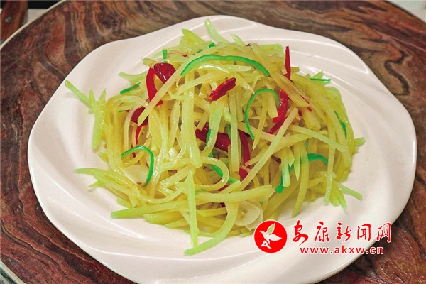 酸辣土豆絲:使用土豆、辣椒、白醋、蔥、姜等制作而成的菜肴,是深受嵐皋老百姓喜愛的一道家常菜,也是嵐皋人餐桌上最常見的家常菜,其主料土豆性平和味,有改善腸胃功能、預防高血壓的功效。
