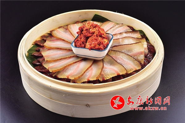 砧板臘肉:松果碳木熏制的臘肉,只需經過簡單的加工,即可做出美味的食品,這是地地道道的嵐皋巴人美食。