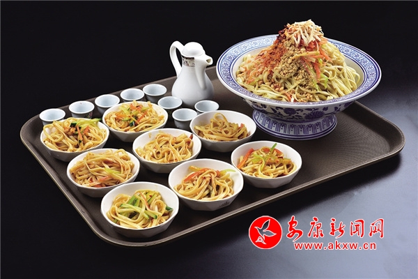 老街涼面:采用家傳手藝,主料為手工堿面,煮熟后用甘甜的冷水過涼,加飄香油辣子、秘制醋湯、蒜泥等精心調味,拌勻即成。堿面可改善人體微酸體質,醋湯解膩、醒酒,既可調味亦可單飲。青翠的黃瓜絲、嬌艷的胡蘿卜絲再加上引人垂涎的酸醋,一份老少皆宜的老街涼面余“味”繞梁。