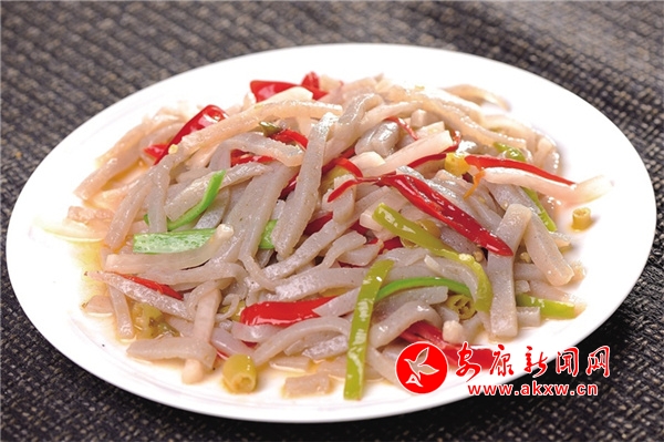酸辣魔芋:是嵐皋特色名菜,也是當地非遺項目之一。以秋收后鮮魔芋漿汁為原料,加入堿水煮制,冷固后呈豆腐形狀,切塊后與當地泡菜一起大火翻炒而成。魔芋中的“堿”和泡菜中的“酸”完美結合,具有保護腸胃、排毒養(yǎng)顏、減肥瘦身的功效,同時還能降血糖、降血脂、降血壓。嵐皋民諺“要見好公婆,多吃鬼腦殼”,說的是姑娘吃了魔芋豆腐,瘦體健身、容光煥發(fā),能得到公婆的好感。現(xiàn)代醫(yī)學認為,魔芋豆腐中含量最大的葡萄甘露聚糖,具有強大的膨脹力,超過任何一種植物膠的黏韌度,既可填充胃腸,消除饑餓感,又因所含熱量微乎其微,故能控制體重、減肥健美。此外,魔芋豆腐既能開胃化食,又能清除腸道垃圾,有防癌抗癌的神奇魔力,享有“防癌魔衣”“神奇食品”的美譽。