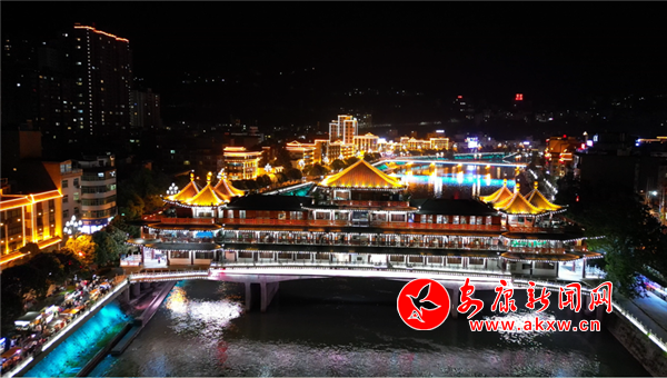 華燈初上,從露營基地回到縣城,大街上人來人往熱鬧非凡。位于縣城中心的河街美食街散發(fā)著濃濃的煙火氣,各色美食吸引了不少游客前來打卡。沿著河濱休閑步道漫步,兩岸燈光將嵐河渲染得絢麗多彩,橫跨嵐河之上的廊橋也在夜色中散發(fā)著迷人的光影。