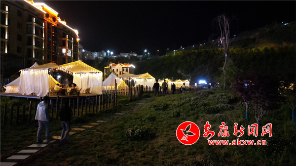 假期第一天,記者來到位于城關鎮(zhèn)羅景坪社區(qū)的嵐谷森野露營基地,只見藍天白云下,統(tǒng)一的白色帳篷在寬敞的草地上依次排開,游樂設施散布其間,人們或躺或臥,或游戲或拍照,一派快樂、安逸的假日氛圍。夜幕降臨,點點彩燈為夜晚的露營基地增添了一抹童話色彩,大家吹著徐徐晚風,吃著各色美食,享受著與家人朋友暢談暢飲的歡樂時光。