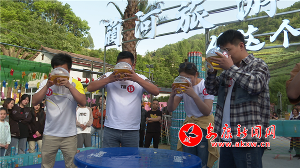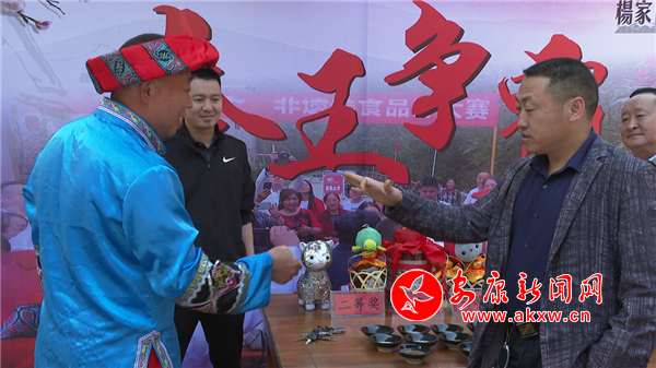 距離鄉(xiāng)愁館不遠的摔碗酒比賽現(xiàn)場熱鬧非凡,一位身著地方特色服飾的村民與游客劃拳定輸贏,游客贏了便能免費得到一壇嵐皋陳釀,游客輸了便要喝摔碗酒一碗,不管輸贏與否,都能引起在場群眾的陣陣歡笑。