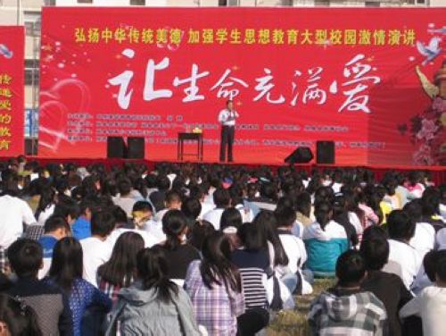 10月10日,由縣委宣傳部、嵐皋縣關(guān)心下一代工作委員會、縣教體局、縣文明辦、縣慈善協(xié)會聯(lián)合舉辦的“讓生命充滿愛”大型校園激情演講活動在我縣體育場隆重舉行!