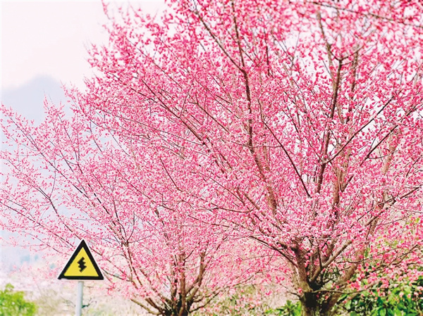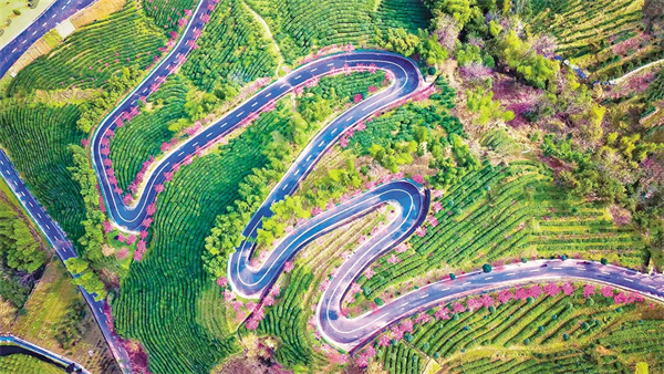 沿著茶山步道拾級(jí)而上,茶農(nóng)采青的竹簍與游人拍照的紗巾在梯田間次第閃現(xiàn)。粉白相間的梅花如云絮般綴滿枝頭,風(fēng)過處,花瓣簌簌落入茶叢,為嫩綠的新芽染上淡淡馨香。遠(yuǎn)處黛瓦白墻的徽派民居與近處起伏的茶壟構(gòu)成天然畫框,無(wú)人機(jī)視角下,蜿蜒的茶道如同玉帶纏繞山腰,將紅楓、櫻花、梅林串成斑斕的珠鏈。