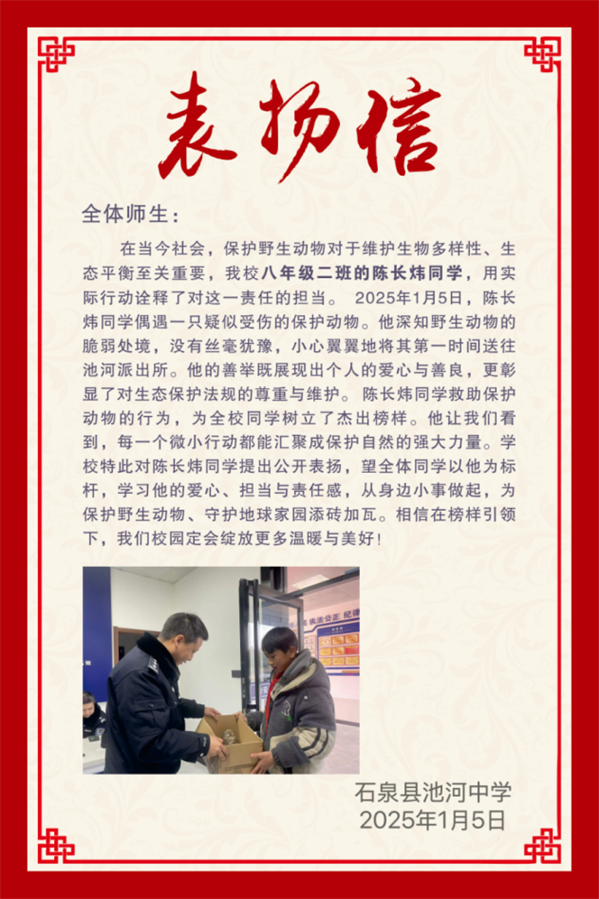 陳長煒的暖心事跡傳到學(xué)校后,學(xué)校發(fā)布了表揚信,公開表揚陳長煒同學(xué)的愛心善舉和保護野生動物的暖心行為。號召全體學(xué)生要學(xué)習(xí)陳長煒的愛心、責(zé)任和擔(dān)當(dāng),從小事做起,從自身做起,保護野生動植物,為保護地球家園、尊重生態(tài)文明的多樣性貢獻(xiàn)力量。