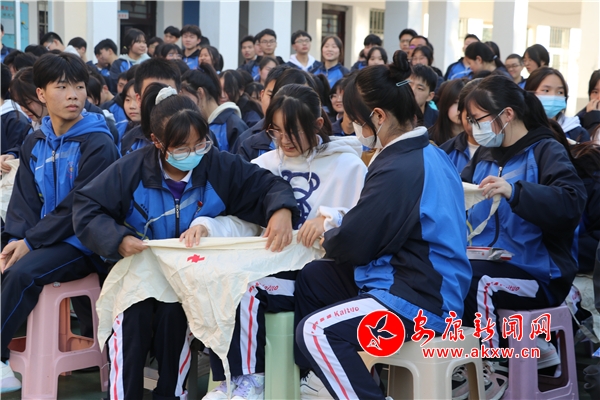 活動(dòng)中,縣紅十字會(huì)工作人員向?qū)W生發(fā)放了三角巾,現(xiàn)場(chǎng)向?qū)W生講解了三角巾的結(jié)構(gòu)和各部分的功能,并以手臂、肩部和胸部三個(gè)部位受傷為例做了操作示范,手把手地指導(dǎo)學(xué)生如何包扎、如何敷料、如何固定、如何打結(jié)。同學(xué)們邊觀察邊實(shí)操,不時(shí)和工作人員進(jìn)行互動(dòng),尋求專業(yè)指導(dǎo),親手體驗(yàn)三角巾包扎的操作流程,在鍛煉動(dòng)手實(shí)踐能力的同時(shí),掌握身體受傷的應(yīng)急處理技能,增強(qiáng)應(yīng)對(duì)突發(fā)事件的自護(hù)自救和科學(xué)救護(hù)能力。