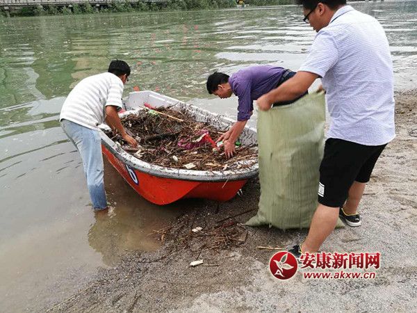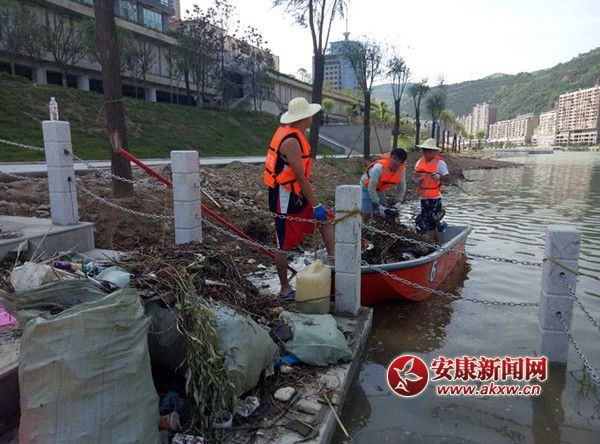 安康新聞網(wǎng)訊(通訊員 王力)7月9日,旬陽縣濱河公園,頂著烈日打撈旬河漂浮垃圾,旬陽縣防汛辦工作人員及漢江綜治辦工作人員 。