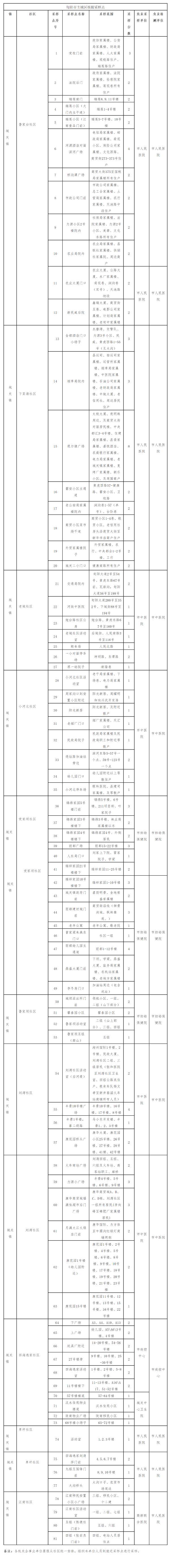 三、點位設置:共設置81個采樣點(見附件),由城關鎮(zhèn)政府安排10個社區(qū)網(wǎng)格管理人員,分時段有序組織應檢人員到指定地點進行核酸采樣。