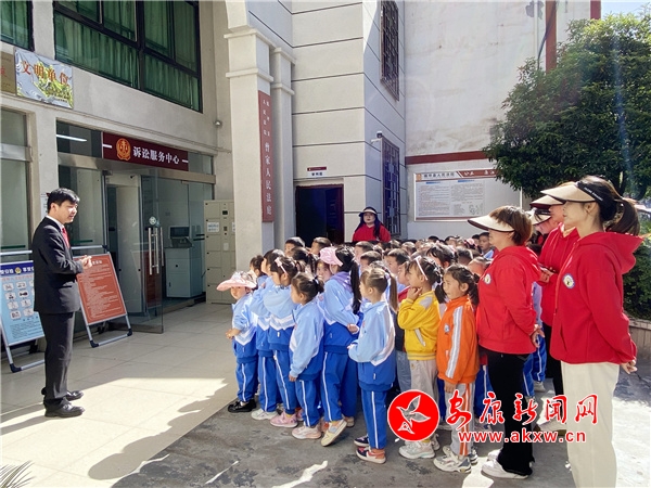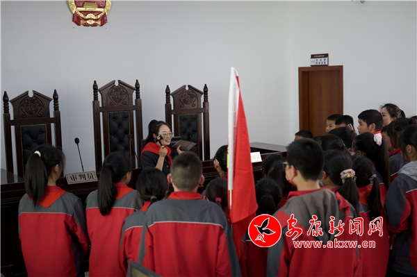 在參觀過(guò)程中,干警帶領(lǐng)同學(xué)們走進(jìn)訴訟服務(wù)中心和干警辦公室了解了法院干警的工作場(chǎng)所。隨后,帶領(lǐng)同學(xué)們參觀審判庭,現(xiàn)場(chǎng)向同學(xué)們介紹科技審判法庭的功能及庭審流程,并展示了法袍、法槌和法徽,同時(shí)用深入淺出的語(yǔ)言和提問(wèn)互動(dòng)的方式向孩子們講解了法袍、法槌和法徽的象征意義,同學(xué)們興趣濃厚,紛紛走上審判臺(tái),親身感受和觸摸審判設(shè)施,感受法庭審判的嚴(yán)肅和莊重。