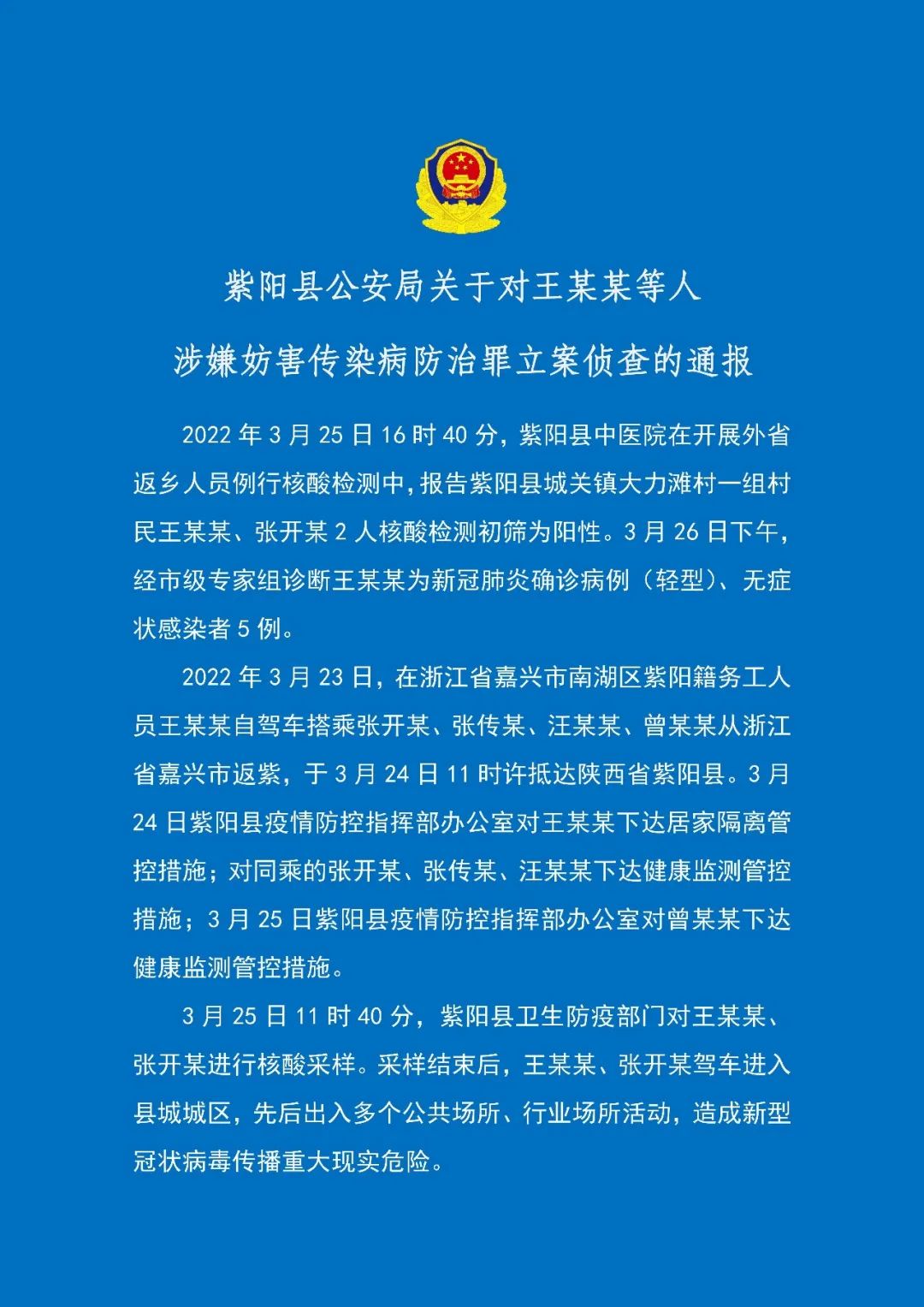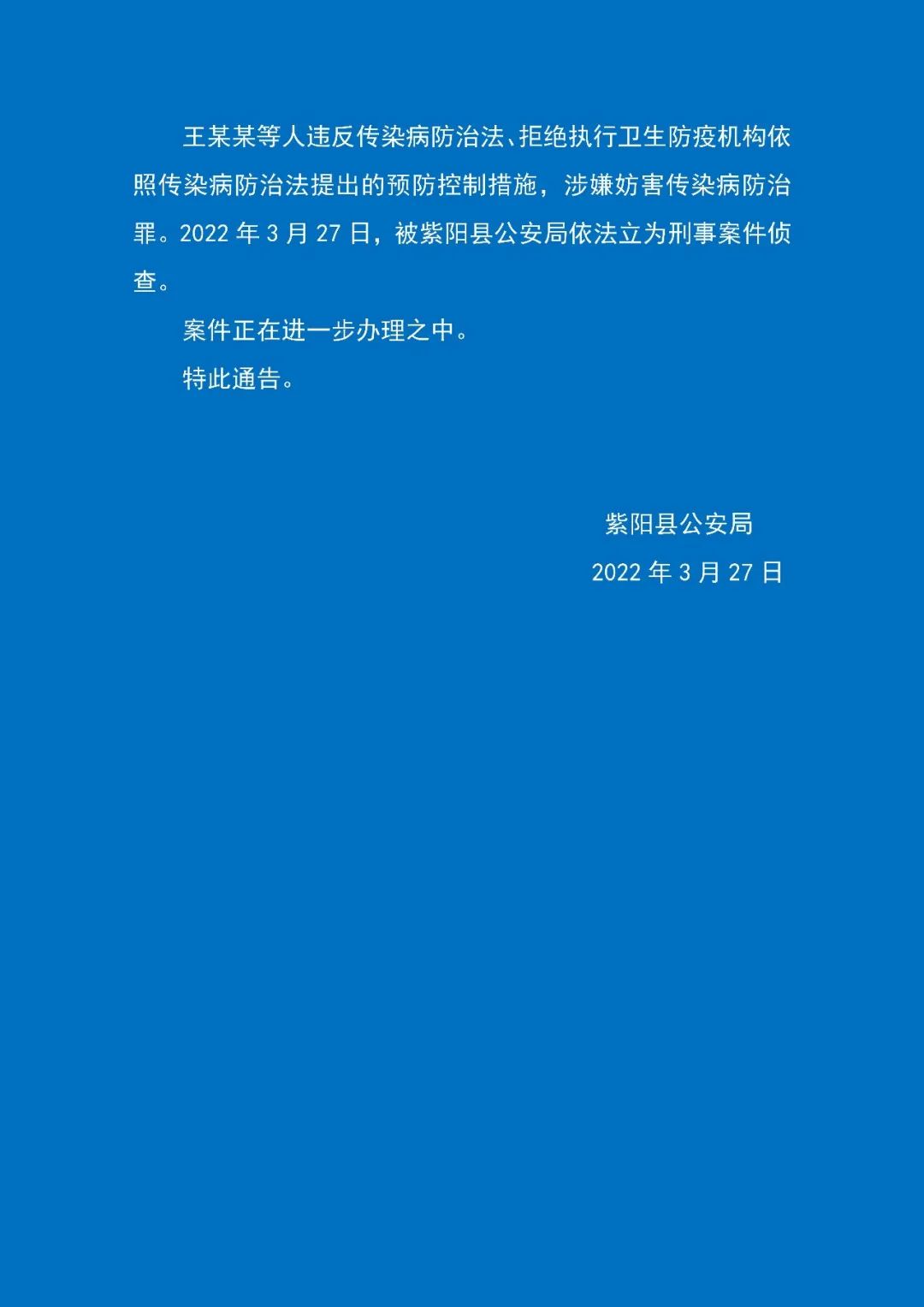 紫陽(yáng)縣公安局關(guān)于對(duì)王某某等人涉嫌妨害傳染病防治罪立案?jìng)刹榈耐▓?bào)