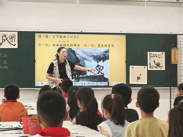 活動中,鐘樓第二實驗小學副校長方文婷和常州經(jīng)開區(qū)教學部主任楊婷老師分別呈現(xiàn)了一年級美術(shù)課程《葉子片片》和《練筆成圖》。兩位老師的課程內(nèi)容充滿創(chuàng)新與深度。授課內(nèi)容從印刷術(shù)與拓染法相結(jié)合,引導學生們探索美術(shù)與生活的緊密聯(lián)系,到通過手指操的引導,幫助孩子們在逐漸掌握水墨畫的基本坐姿和執(zhí)筆方法中感受傳統(tǒng)文化魅力。