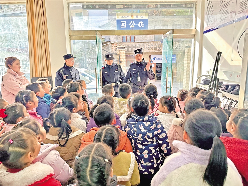 1月8日,紫陽縣公安局高橋派出所舉行“萌娃進(jìn)警營 警心伴童心”主題110宣傳日警營開放活動(dòng),邀請轄區(qū)學(xué)校師生走進(jìn)警營,感受警營文化。陳益謙 攝VVF安康新聞網(wǎng)