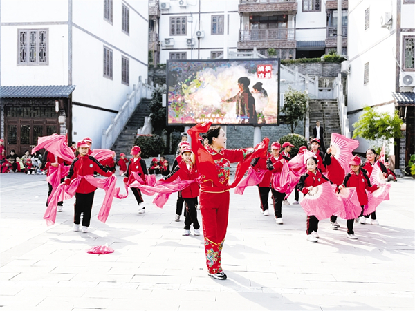 近年來(lái),煥古鎮(zhèn)立足千年茶鄉(xiāng)底蘊(yùn),創(chuàng)新打造“茶旅+非遺研學(xué)”特色品牌,推動(dòng)文旅產(chǎn)業(yè)高質(zhì)量發(fā)展。該鎮(zhèn)通過(guò)“政企校”三方聯(lián)動(dòng),精心開(kāi)發(fā)了三大特色研學(xué)課程體系。在生態(tài)茶園, 學(xué)員們身著傳統(tǒng)采茶服飾,學(xué)習(xí)“一芽?jī)扇~”的采摘標(biāo)準(zhǔn)。非遺傳承人現(xiàn)場(chǎng)示范“徒手炒青”絕技,學(xué)員們通過(guò)“看、聞、摸”感官體驗(yàn),領(lǐng)悟“殺青火候”的精髓。茶文化館內(nèi),村干部通過(guò)全息投影技術(shù),生動(dòng)再現(xiàn)唐代貢茶制作場(chǎng)景;在每周三、六定期舉辦的社火展演中, 省級(jí)非遺傳承人帶領(lǐng)學(xué)員研習(xí)“彩龍船十八式”和“舞龍九式”,從基本步法到隊(duì)形變換,進(jìn)行系統(tǒng)教學(xué)。這項(xiàng)已成為古鎮(zhèn)特色文旅IP的活動(dòng),今年已培養(yǎng)青少年傳承人150余名,最小學(xué)員僅8歲;在清代建筑吊腳樓里, 非遺傳承人采用“口傳心授+數(shù)字樂(lè)譜”的創(chuàng)新教學(xué)方式,教授《郎在對(duì)門唱山歌》等曲目。通過(guò)方言解析、情境再現(xiàn)等形式,讓學(xué)員深入理解民歌背后的文化內(nèi)涵。